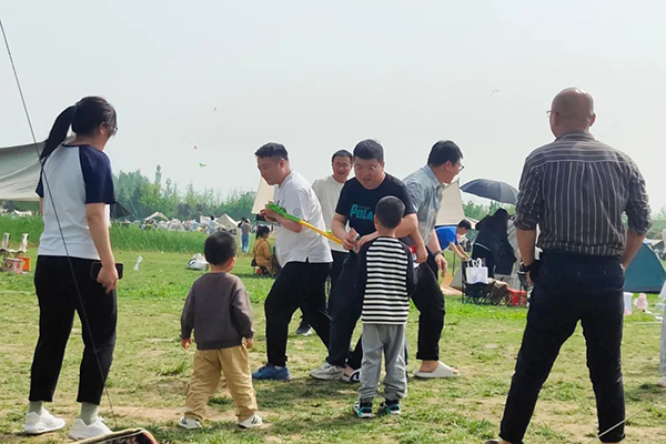 户外团建当然少不了团队游戏。当太阳逐渐隐入云层之际,大家便开启了首个游戏:东西南北跑。四位游戏参与者置身于彩虹圈内,将彩虹圈置于腰间,分别站在东西南北四个方位,全力施力,为自己前方的队友投喂零食。大家全力以赴,沉浸在游戏中,拉近了彼此间的距离。