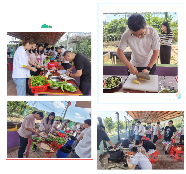 一上午的团建结束了,大家来到野炊区食材库领取了自己的食材,并迅速找到自己对应编号的“农家柴火炉灶”开始生活做饭。大家分工协作,有负责洗菜,有负责切菜,还有负责炒菜的大厨,忙忙碌碌,好不热闹!