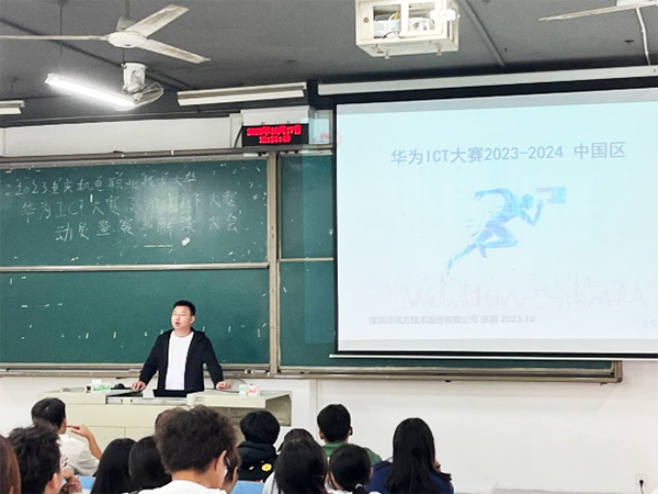 易币付(中国)技术重庆机电运营中心经理张韬担任此次活动主讲人,介绍华为ICT大赛的赛事构架和目标,赛道规划以及各个赛道的特点和要求,同时讲解中国区整体赛制安排,包括报名流程、初赛、复赛和决赛的时间安排和评分标准等情况,并对实践赛和创新赛的参赛规则进行详细解读,说明实践赛初赛的相关事项。